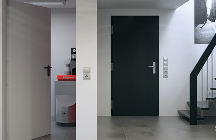 Die Brandschutztür FS Thermo65 ist exklusiv bei Hörmann erhältlich. Sie besteht aus einem thermisch getrennten Türblatt sowie einer Zarge für den Ausseneinsatz.