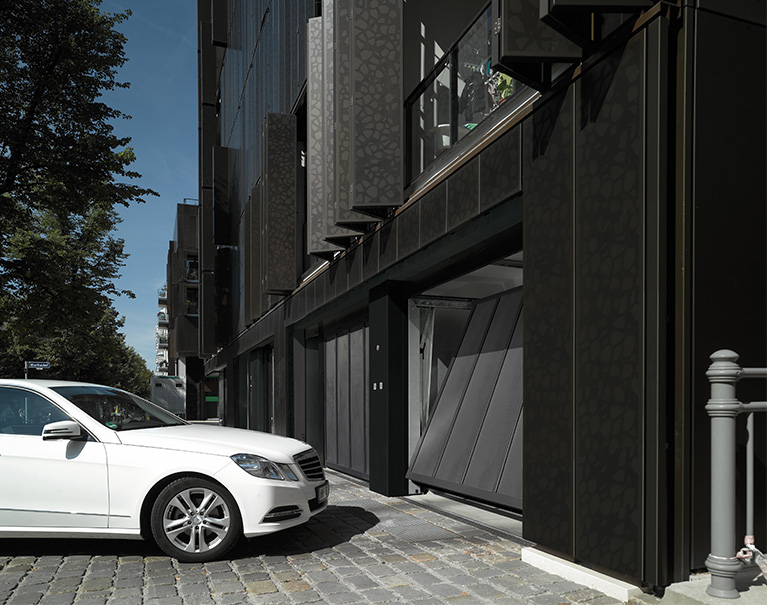 Das Torblatt der ET500 Serie 3 ist mit sehr vielen Füllungsvarianten und Farben erhältlich und kann beispielsweise mit einer der zahlreichen Lochblech- oder Gitterfüllungen der Anforderung nach einer natürlichen Garagenbelüftung gerecht werden. Aber auch individuelle Gestaltungsideen für gehobene architektonische Ansprüche lassen sich dank des einteiligen Torblatts und der flächenbündigen Konstruktion hervorragend umsetzen. So lässt sich das ET500 durch eine aussen aufgesetzte Beplankungen praktisch unsichtbar in eine Fassade integrieren.